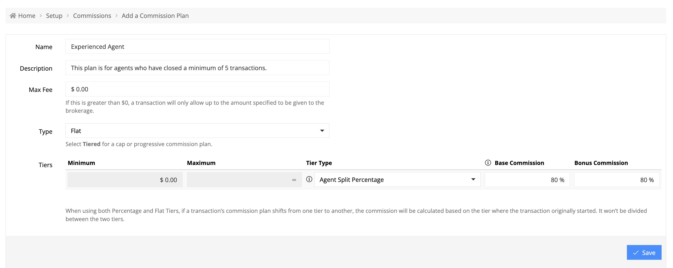 In each tier, you can specify the agent's split that applies to the base commission and the agent's split that applies to the bonus commission. You can choose if each tier is an agent split percentage, a flat broker's fee, or a percentage of a financial value.