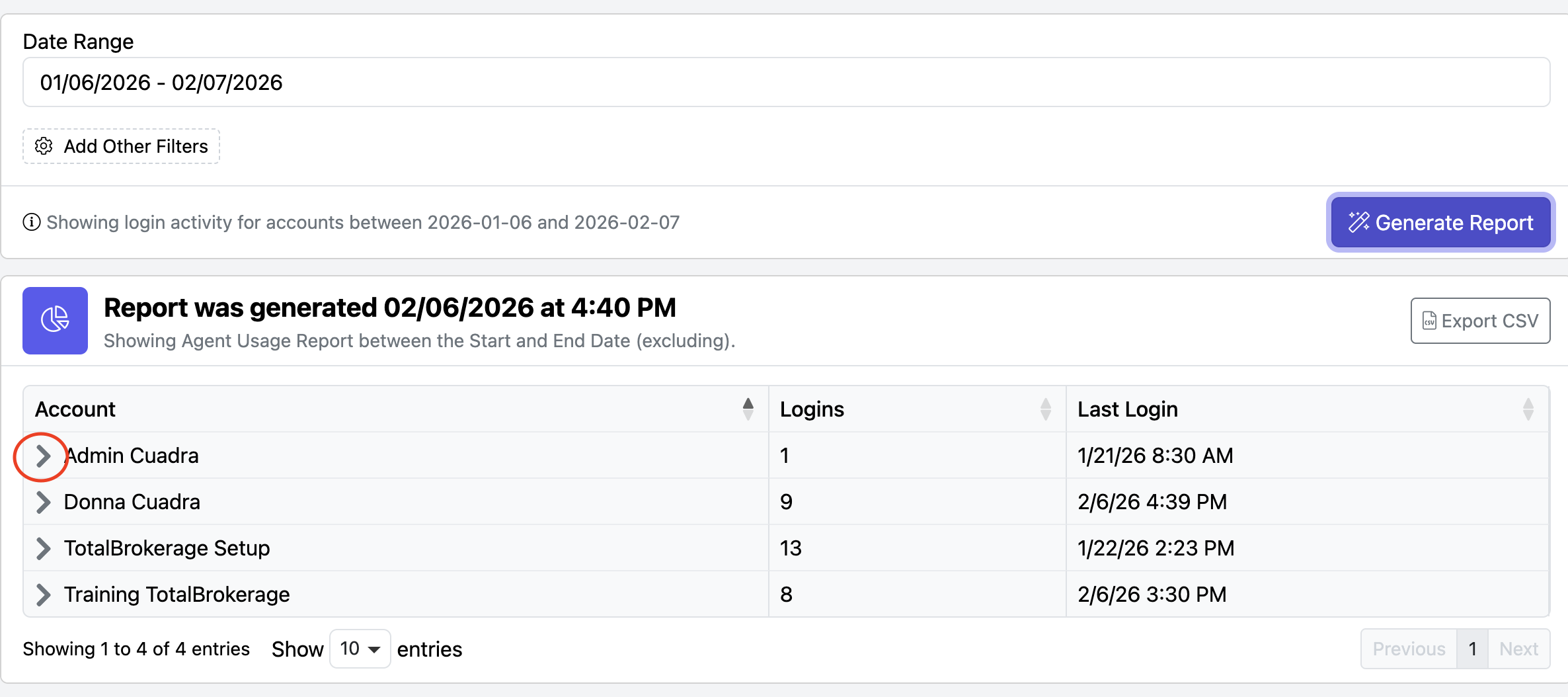 The report provides information on which Accounts have logged in (including the IP Addresses they have logged in from), the number of Logins, and the date & time of the account’s Last Login.