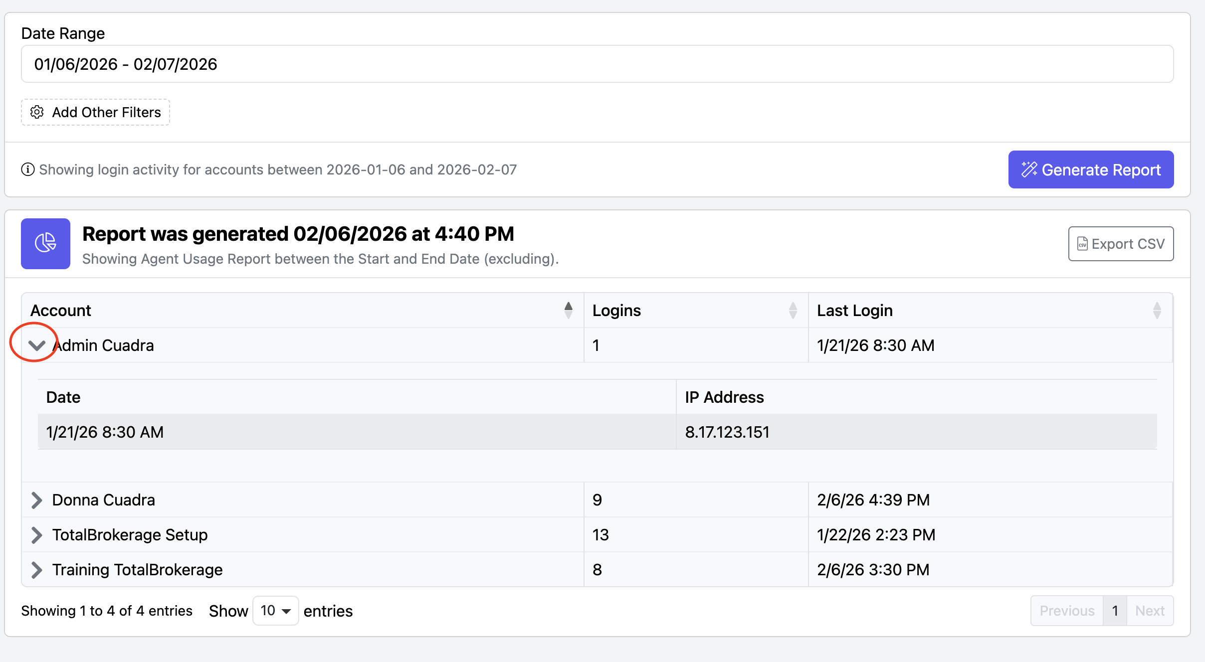 - If you want to see which IP Addresses an agent has logged in from, simply select the ">" icon.