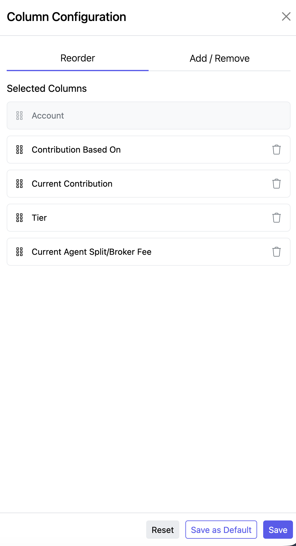 Click the Column Configuration button to adjust the columns' order or add Account Details to the results.