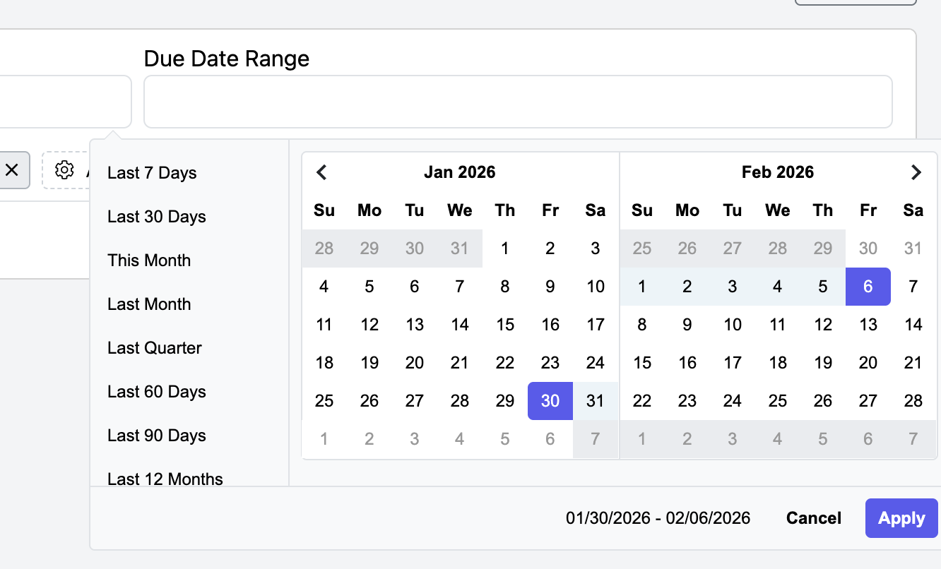 - Enter the Due Date Range by clicking in the box and making your selection. Then click Apply.