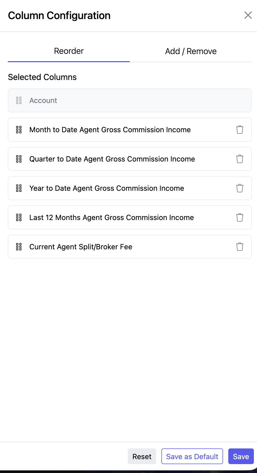 Once you have made your changes, click on Save as default to make the same arrangement available for future reports.