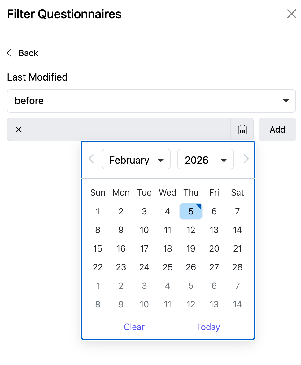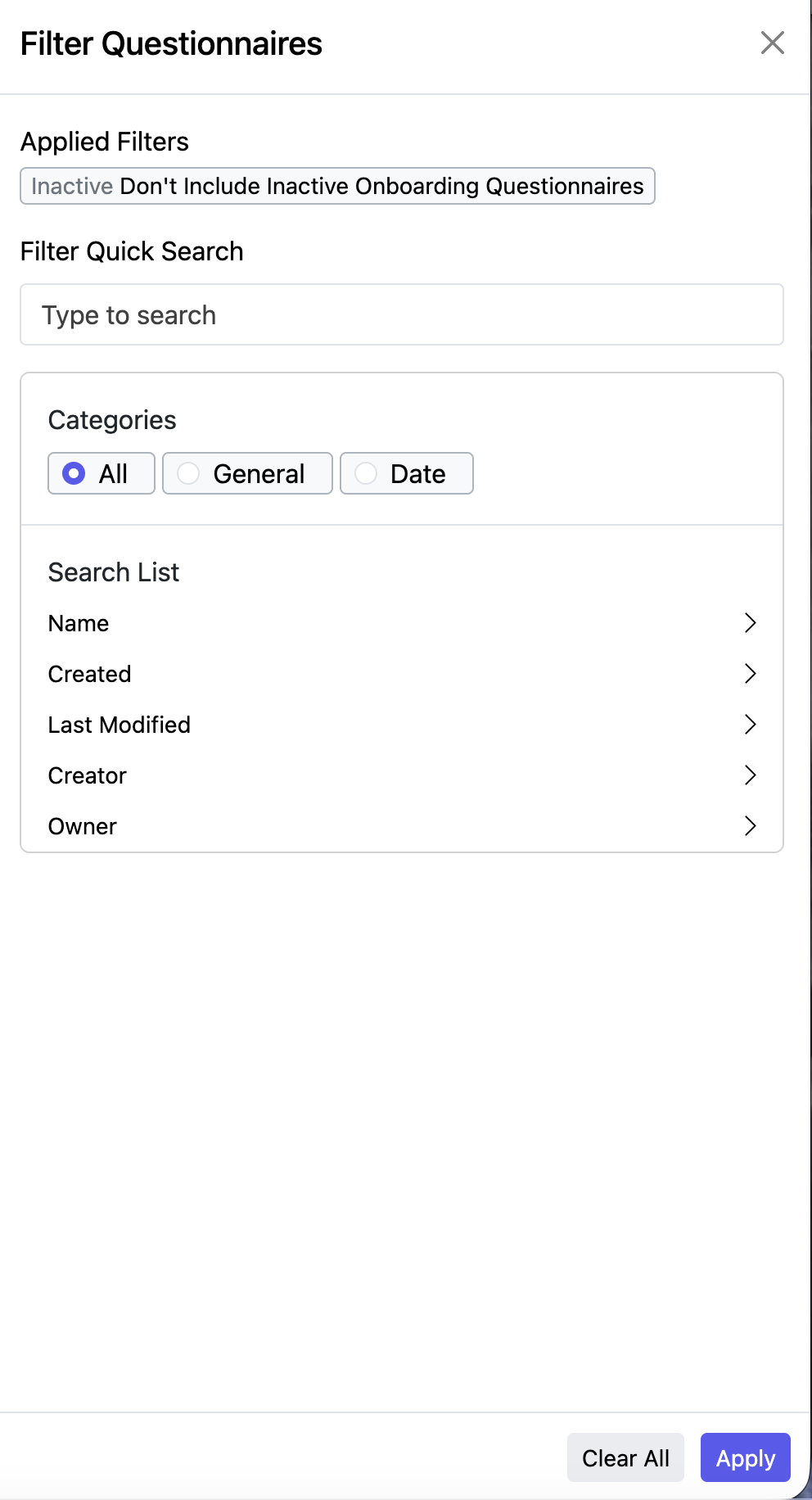 Search by name, the date the Questionnaire was created, the date it was last modified, who created it, the level of ownership, or whether to include inactive Questionnaires.