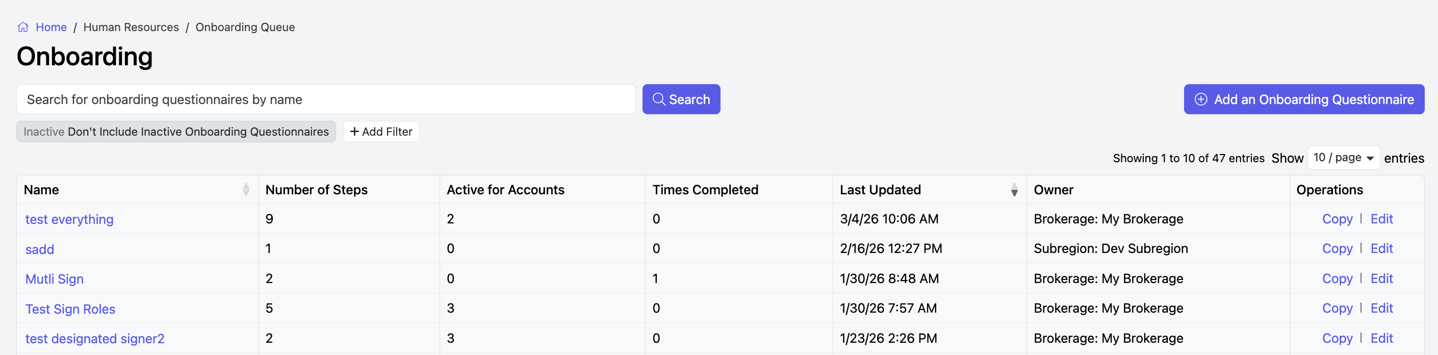 Click Add an Onboarding Questionnaire or click Edit to change an existing onboarding.
