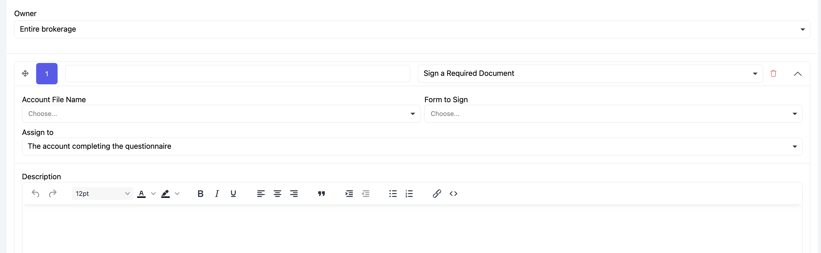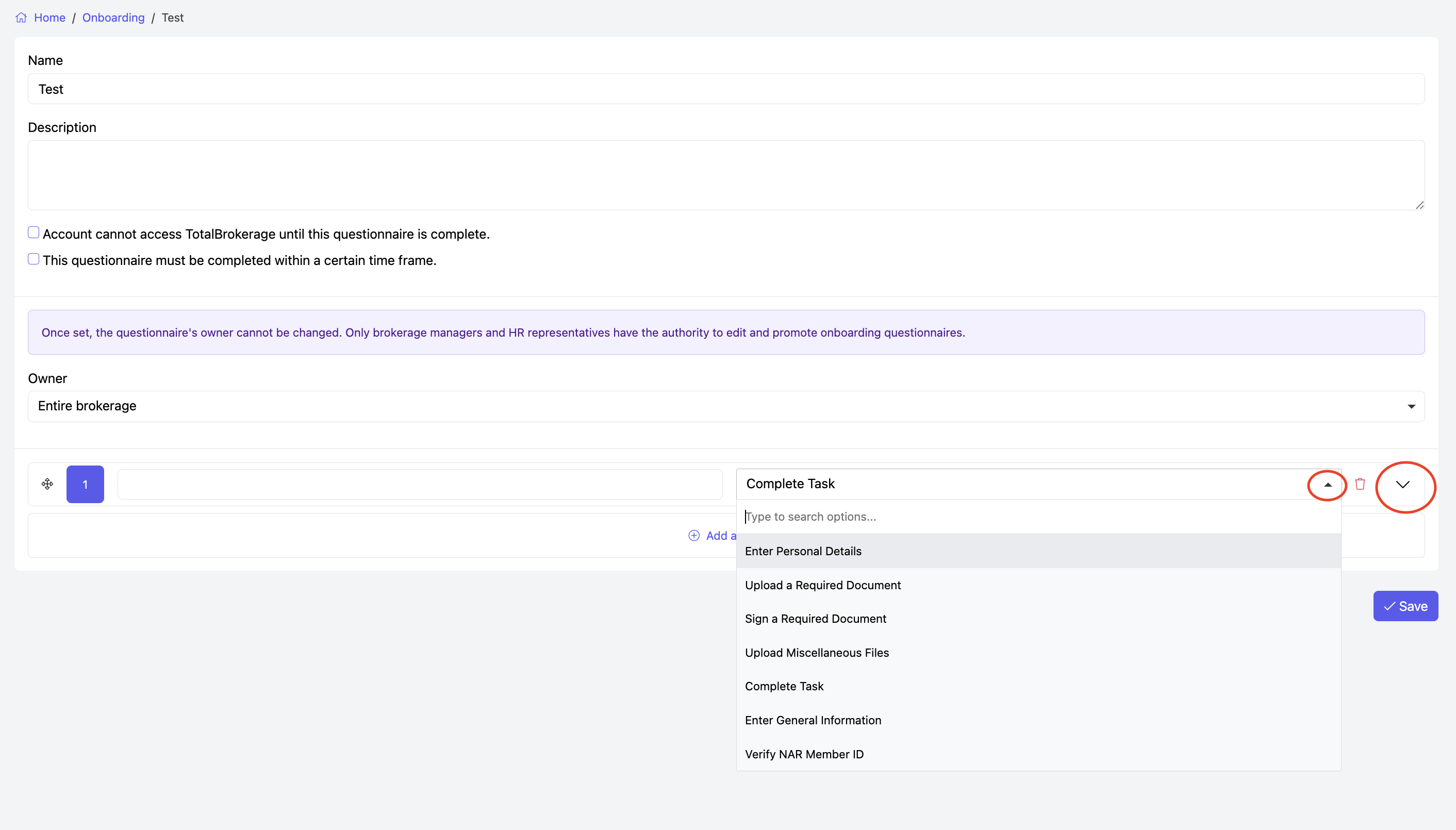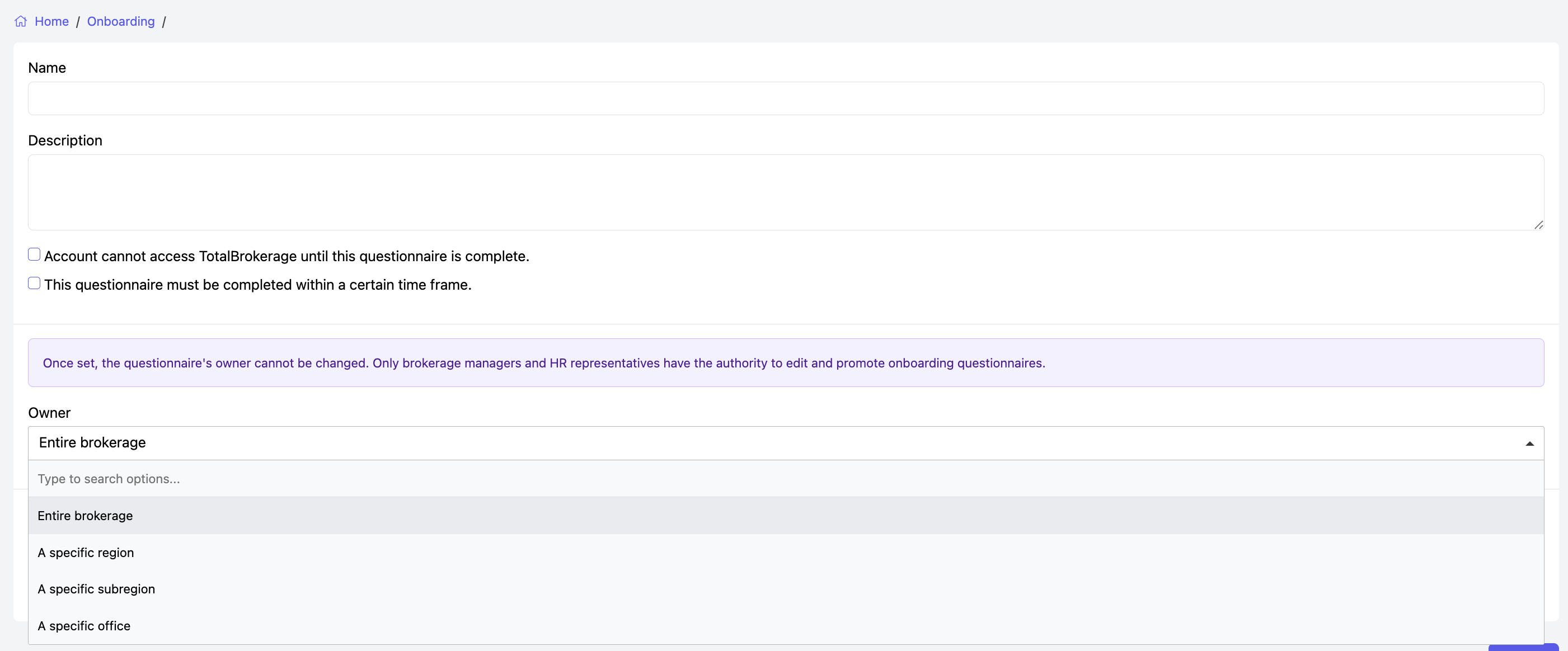 - Select the Owner of the questionnaire — this can be the Entire Brokerage, a Region, Subregion, or an Office — and choose (if applicable).