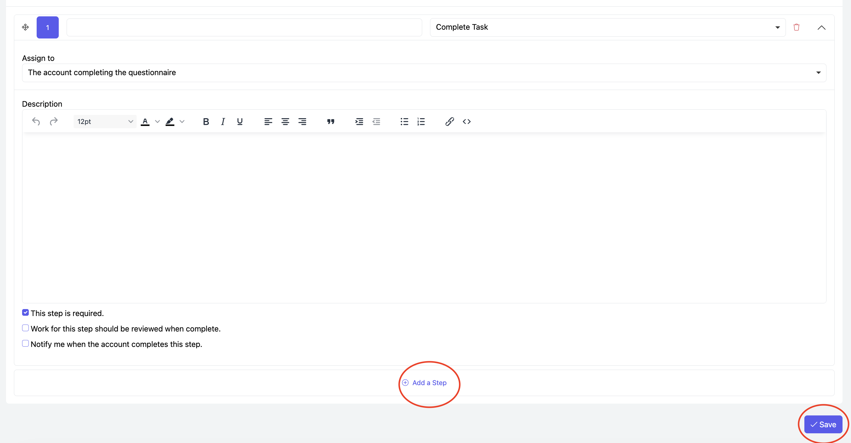 In Description, you can include extra details for the individual completing this step, such as images, links, and HTML content.