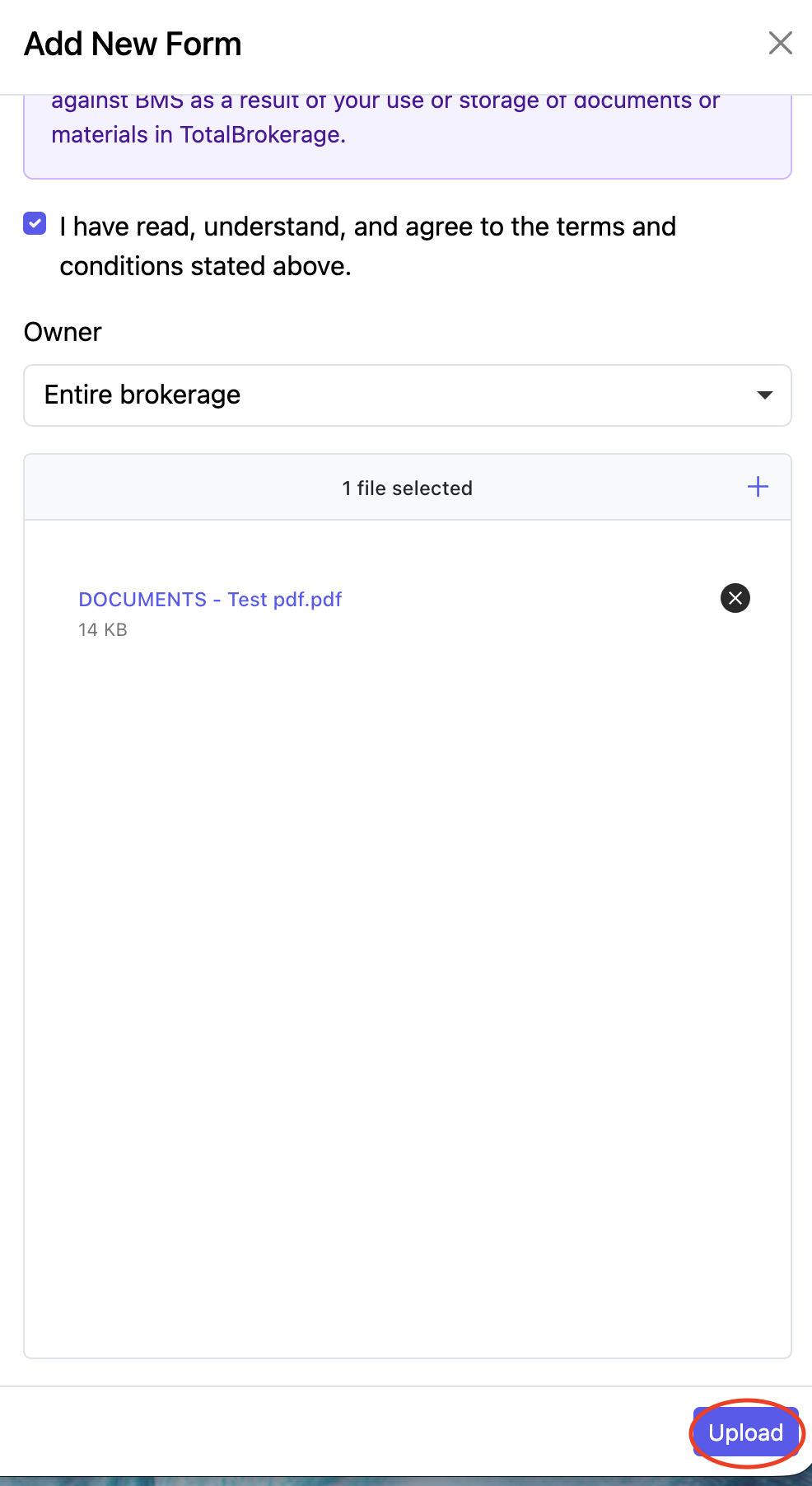 Check off the Disclaimer and Set Ownership – On the new page, check the disclaimer and select whether the form will be owned by the Brokerage, Office or specific Account.