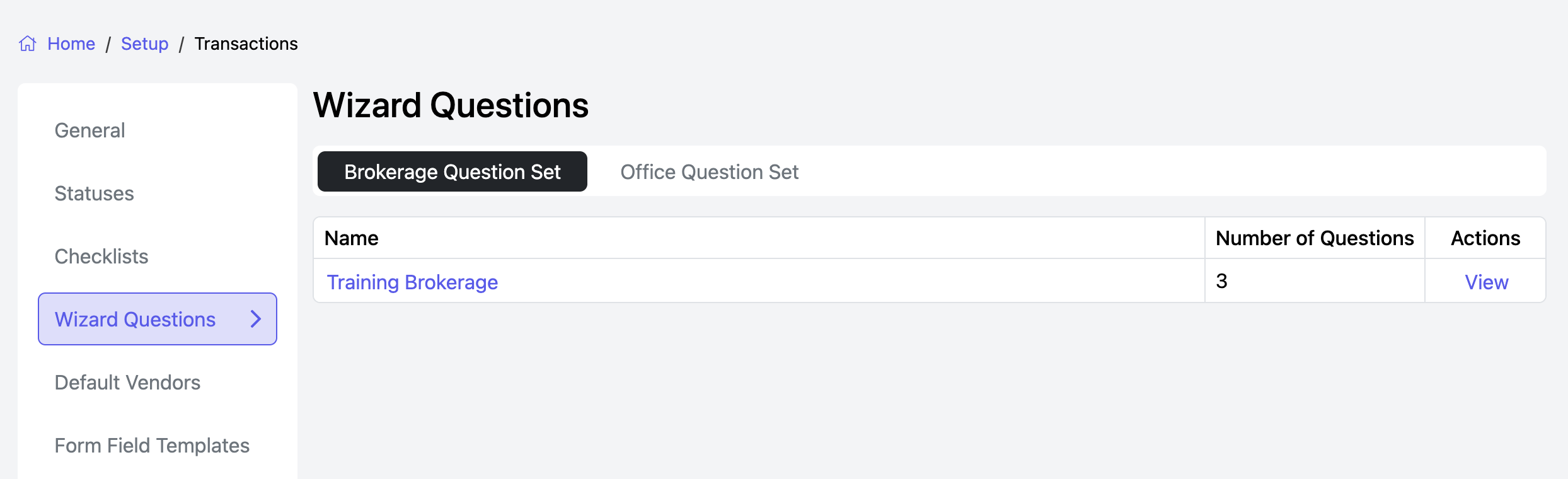 To view or edit questions for the Brokerage or a particular office, you can either click on the name in the Question Set Name or click "View" to the right.