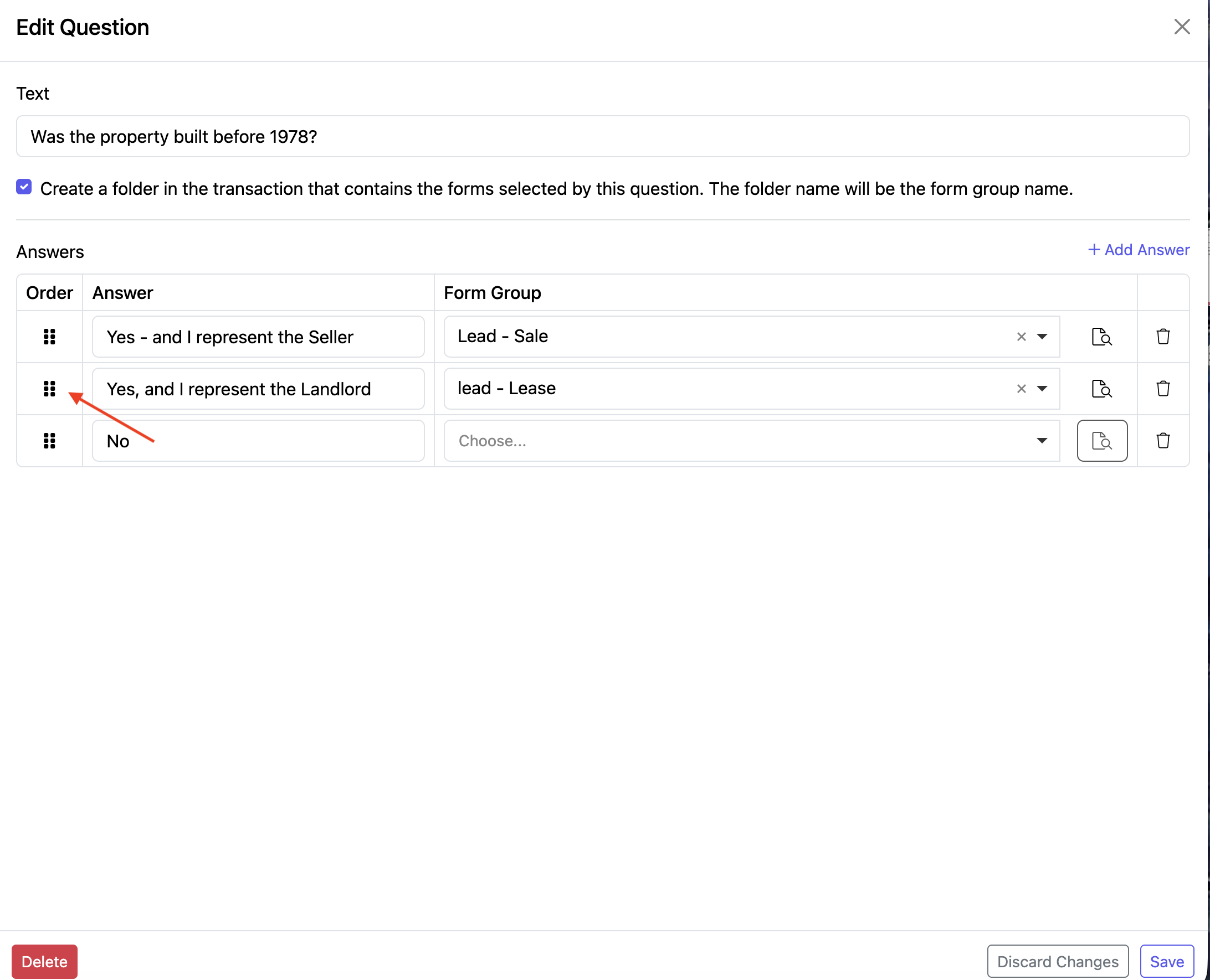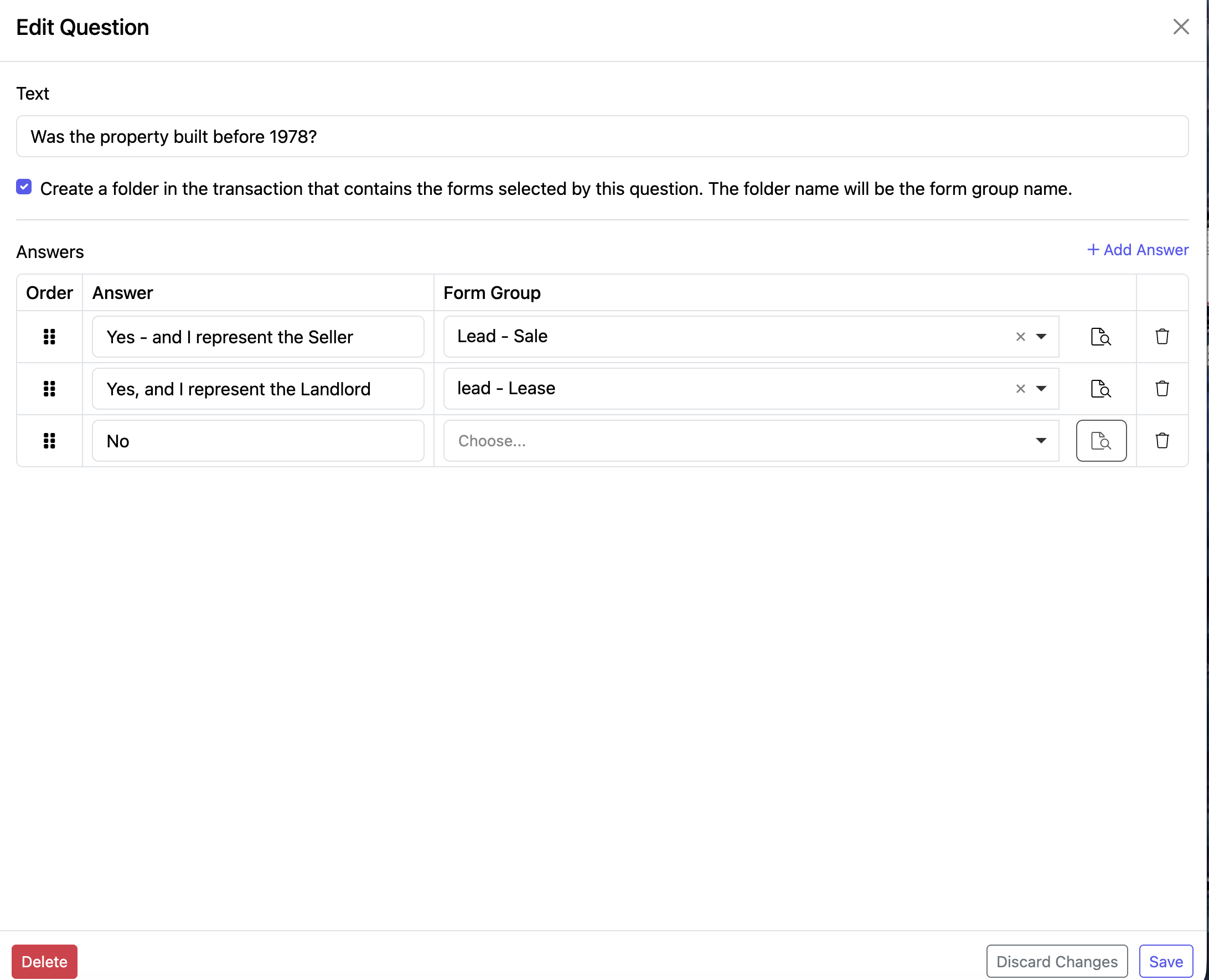 “Create a folder in the transaction that contains the forms selected by this question. The folder name will be the form group name.” This helps keep your transaction documents neatly organized based on the form group selected.
