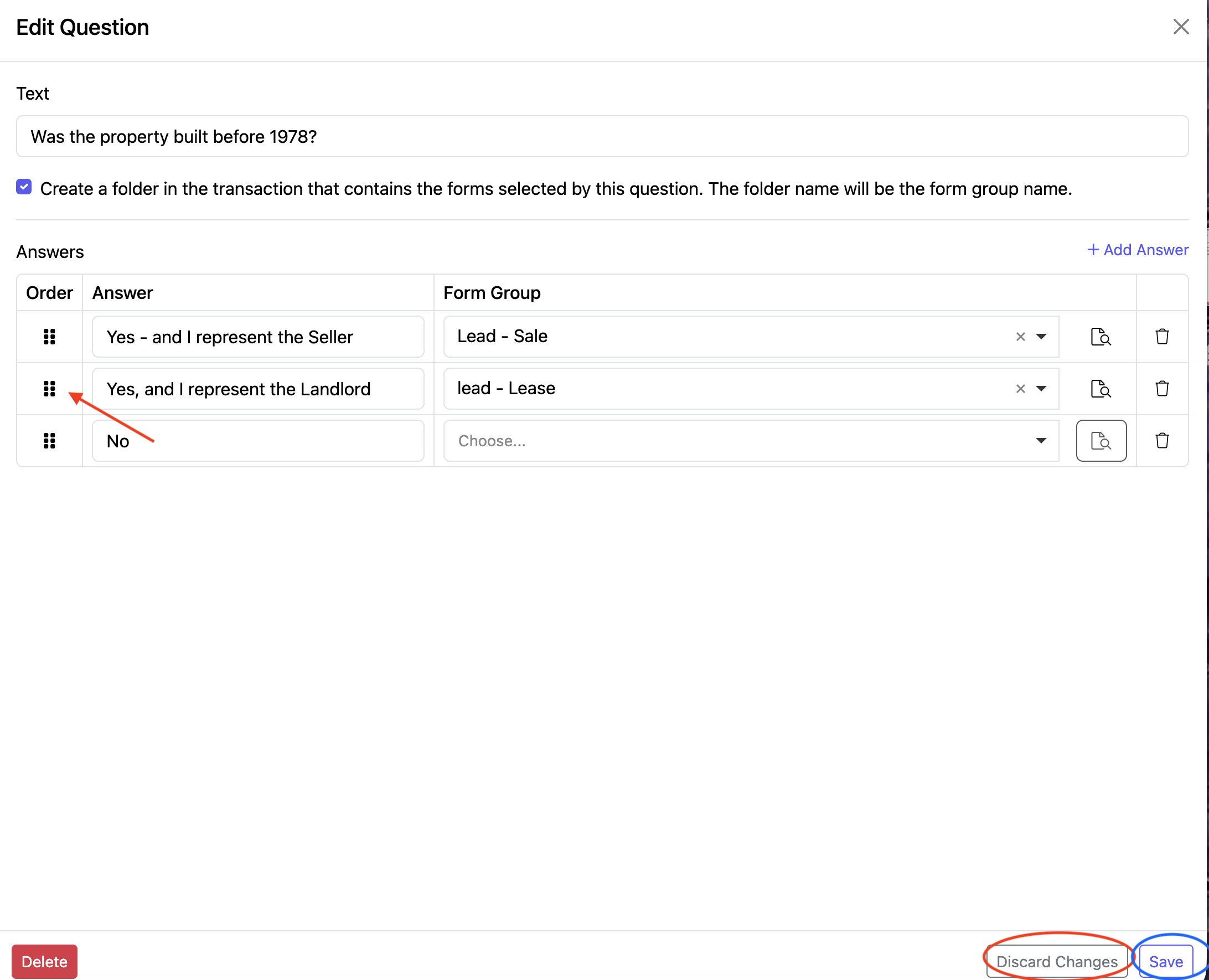 To delete a question, simply click "Delete" at the bottom left of the page.