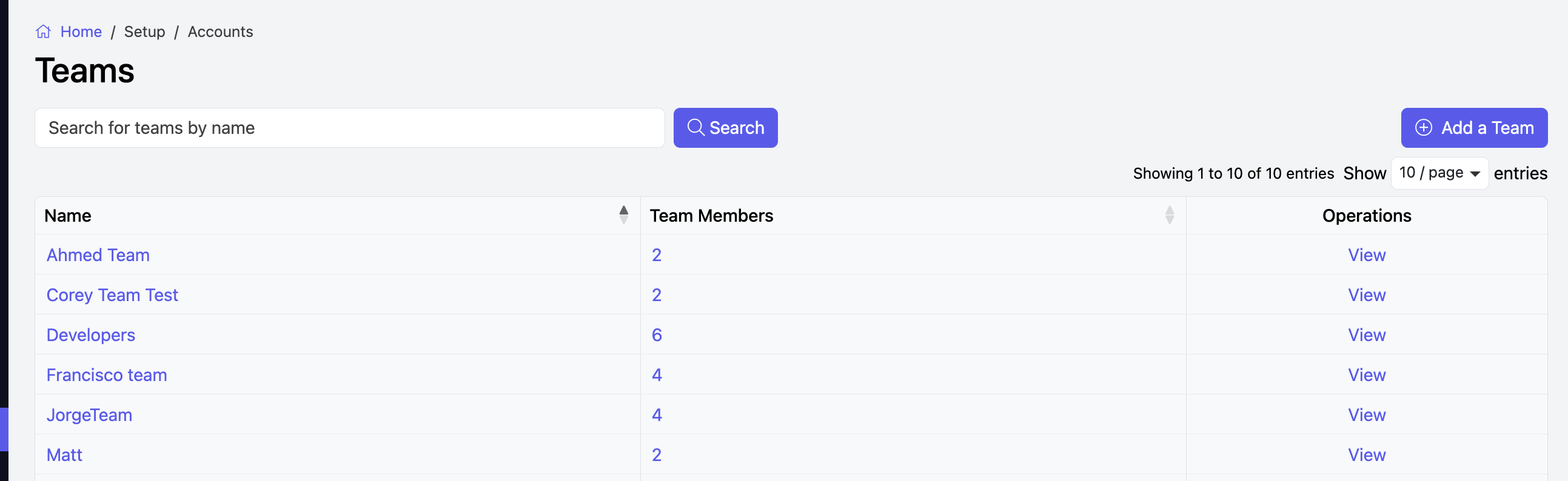 To add a new team, click Add a Team at the top right.