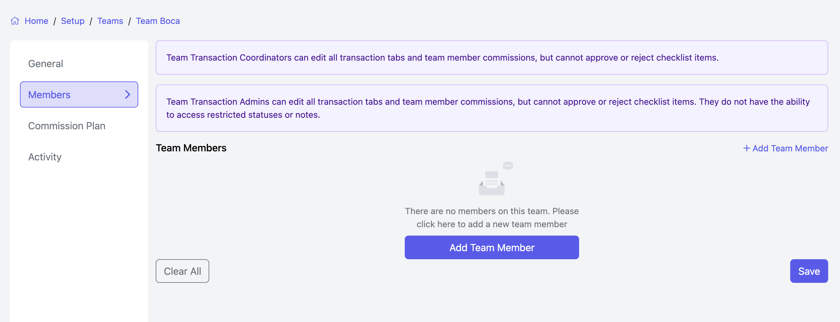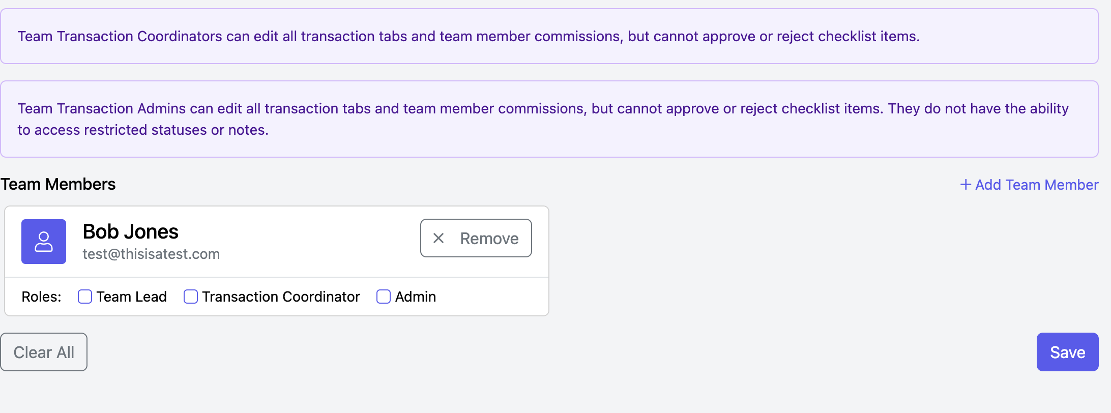 - Transaction Administrator: Team Transaction Admins can edit all transaction tabs and team member commissions but cannot approve or reject checklist items. They also cannot access restricted statuses or notes.