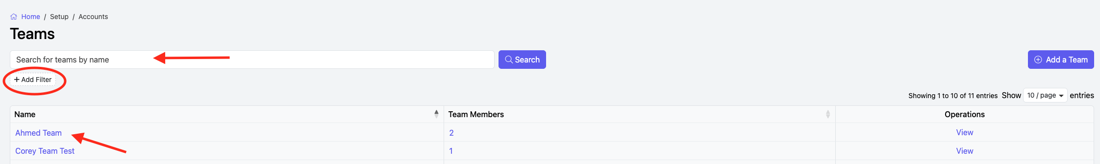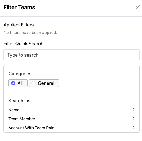 - You can Filter by Team Name, Team Member or Account with Team Role.