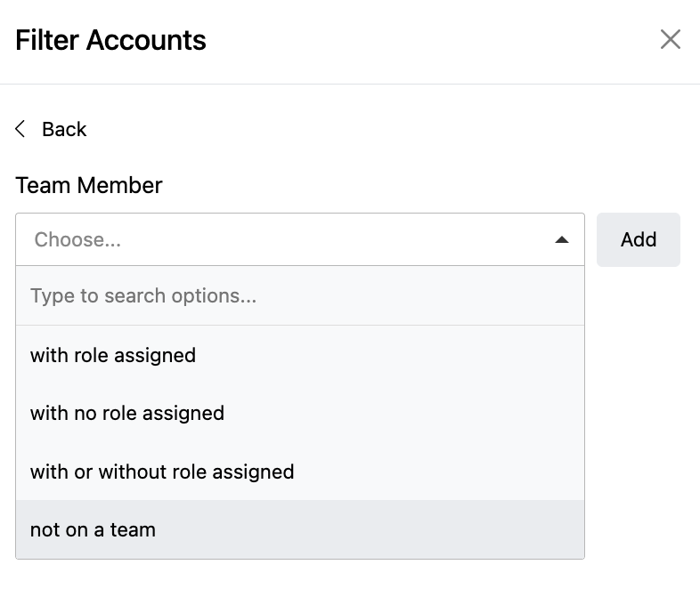 Team Member Search: Use the General Team Member field to search for accounts on a team with roles, without roles, or not on a team at all.