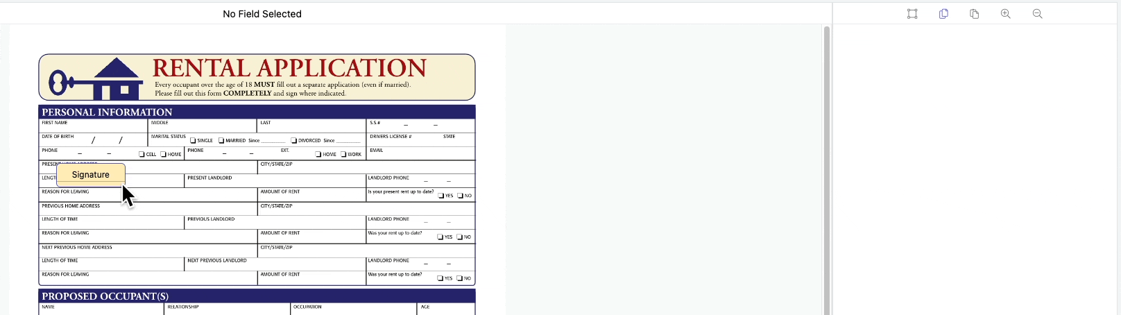 - Displays the document and all added fields. All pages of the document are loaded, allowing you to scroll through and view them.