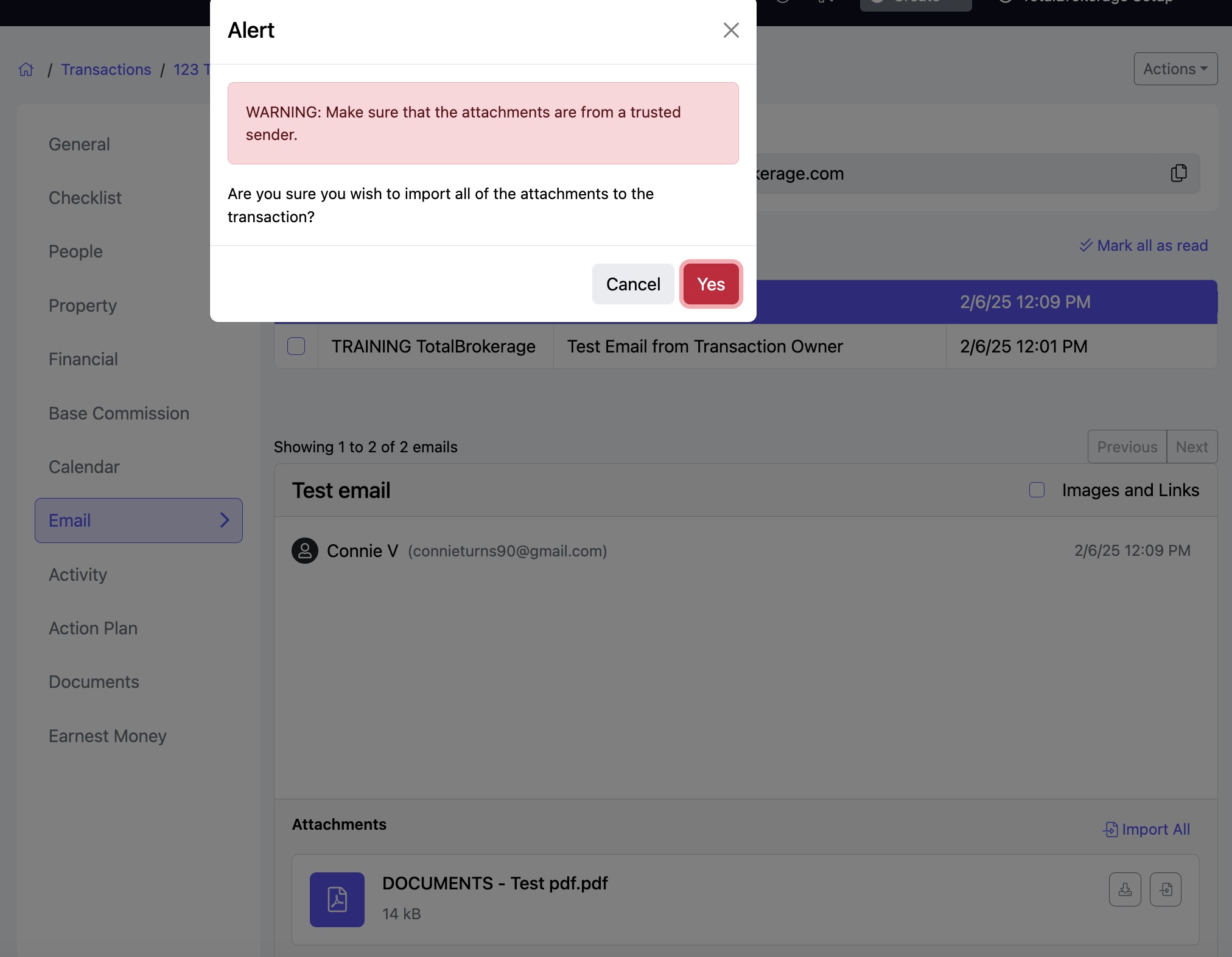 Because this email was sent from the Transaction Owner's email address, any attached PDF's will be Imported to the Documents tab.