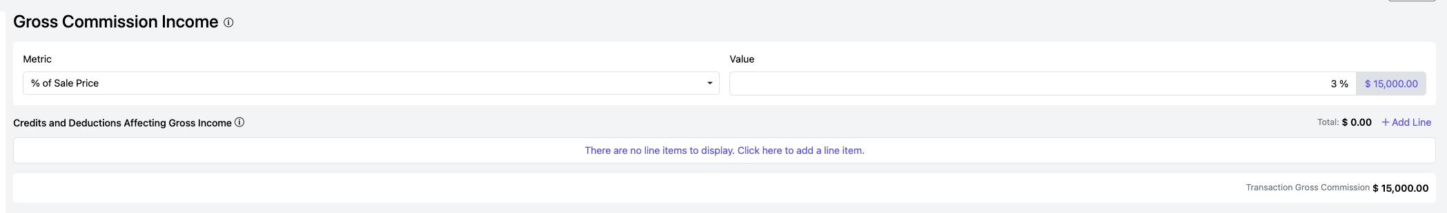 Under Credits and Deductions Affecting Gross Income, you can add line items that apply to the gross commission, which will be shared with agents participating in the transaction.