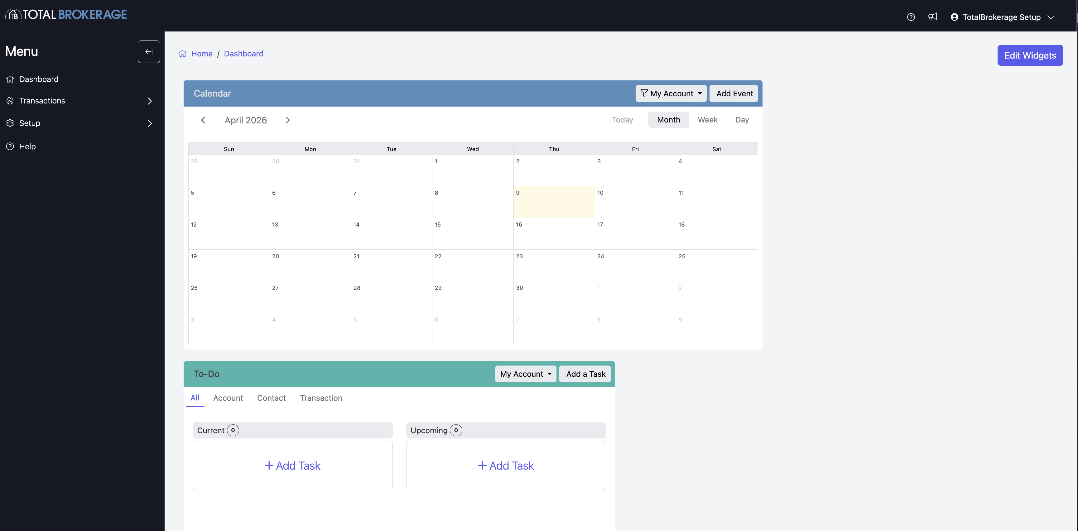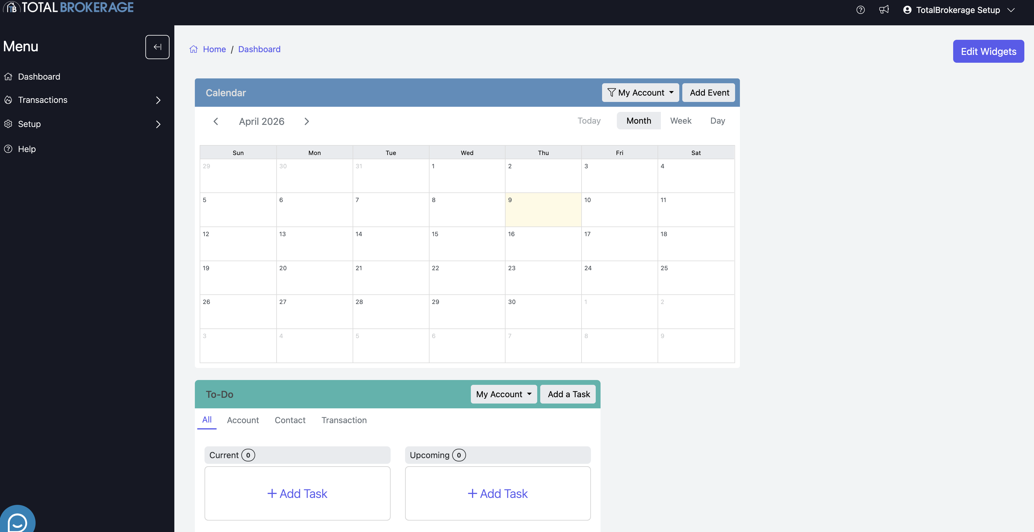 FULL DASHBOARD - if you select to use the Full Dashboard, you will be able to add Widgets which will allow you to track transacation information for the Brokerage and/or specific Accounts (agents).